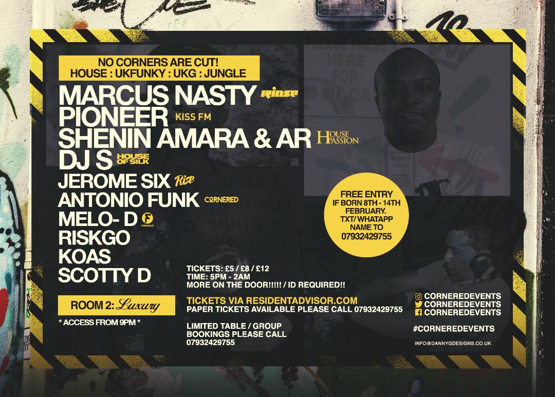 No Corners are cut! House : UKFunky : UKG : Jungle Marcus Nasty (Rinse FM) DJ Pioneer (Kiss FM) Shenin Amara & AR (Cuff, House Passion) DJ S (UK) (House of Silk) Jerome Six (Rise) Anton...