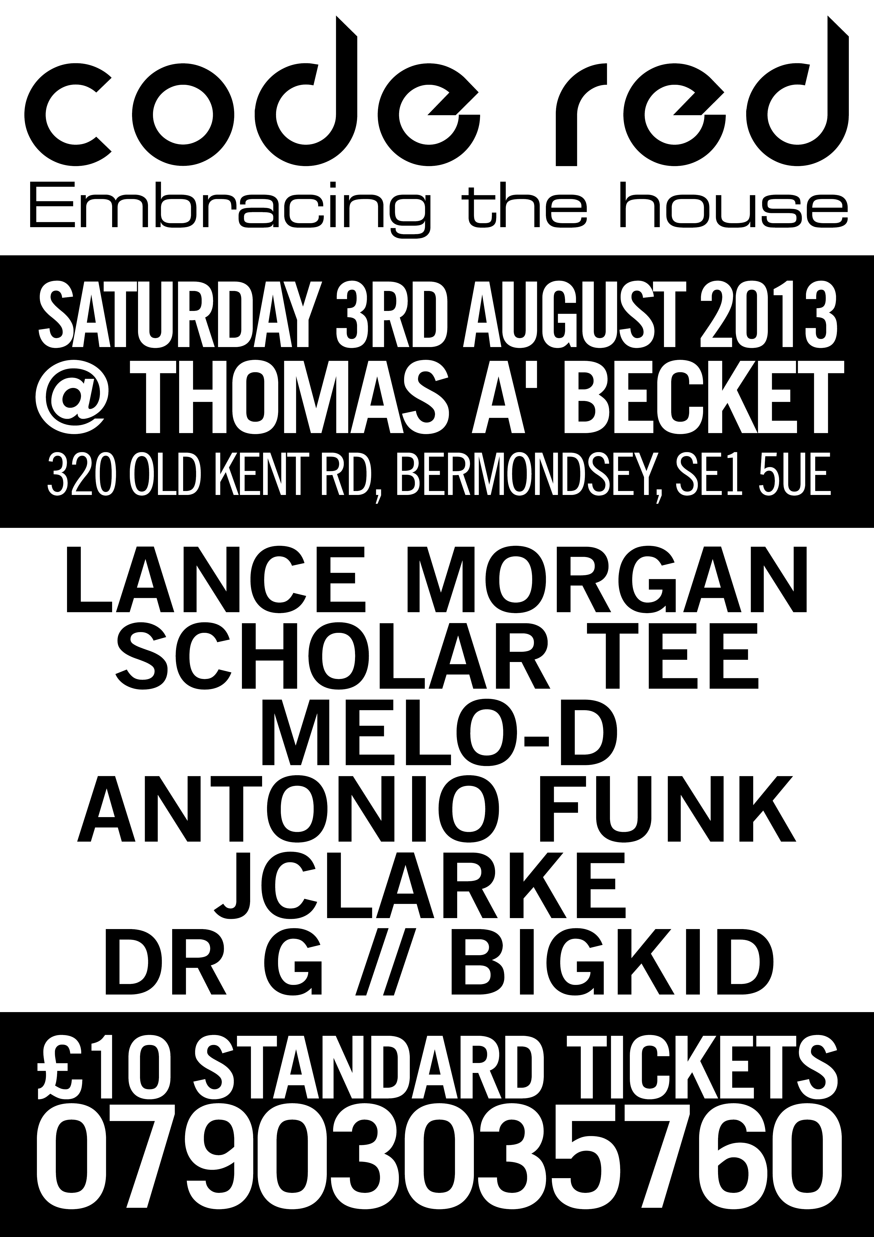 ☆ CODE RED ☆ -EMBRACING THE HOUSE- SATURDAY 12TH OCTOBER 2013 @ THOMAS A' BECKET (SE1 5UE) FREE CD DOWNLOAD COMING SOON - DOWNLOAD IT. ENJOY IT. REPOST IT. TIDY UP TO IT - CODE RED returns...